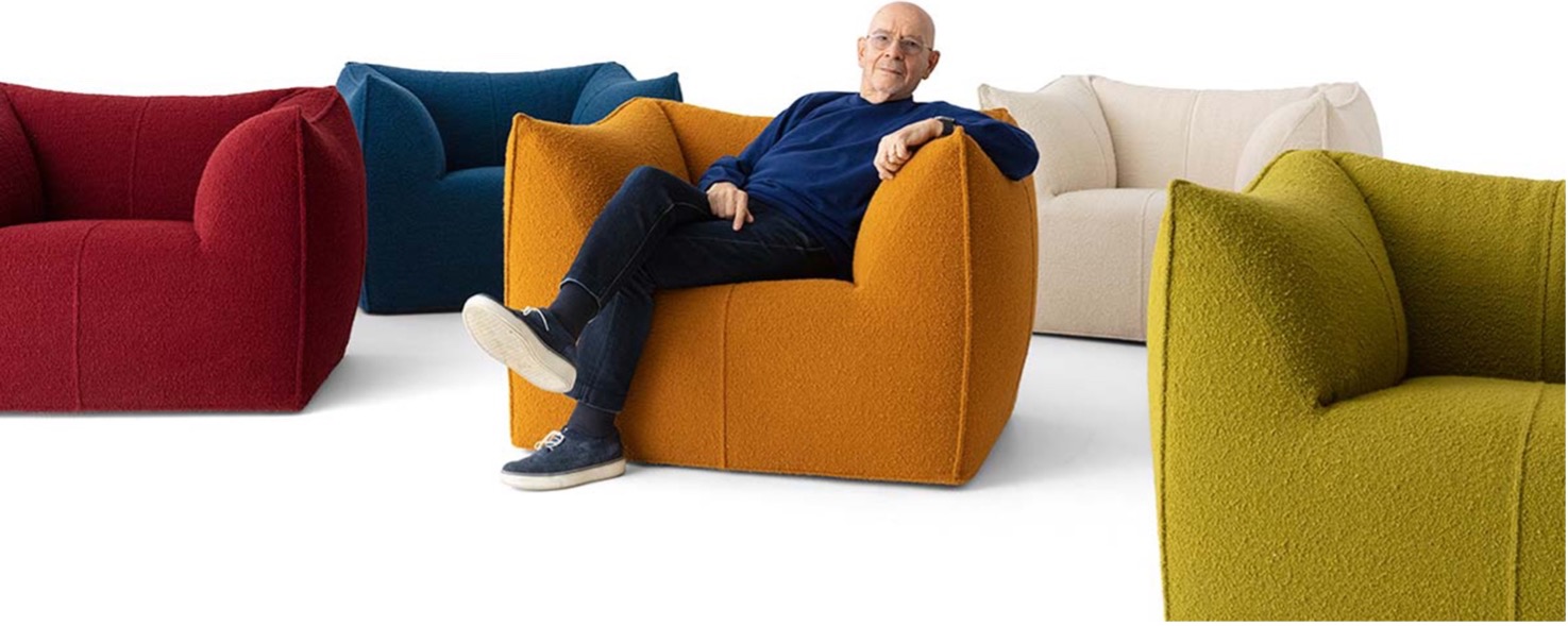 (Mario Bellini seduto su Le Bambole del 1972, Photo courtesy B&B Italia)
