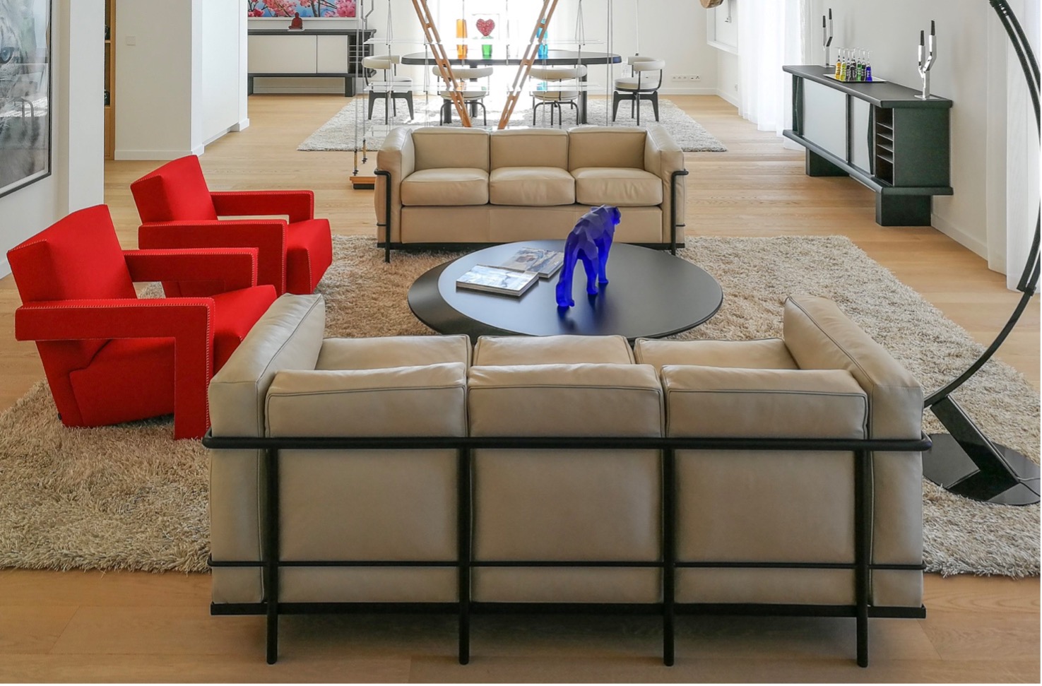 (Projet de résidence privée d’Ameublement Fogliarini avec fauteuil Utrech – canapé LC2 – table basse Accordo – buffet Riflesso et bibliothèque Il Veliero de Cassina)