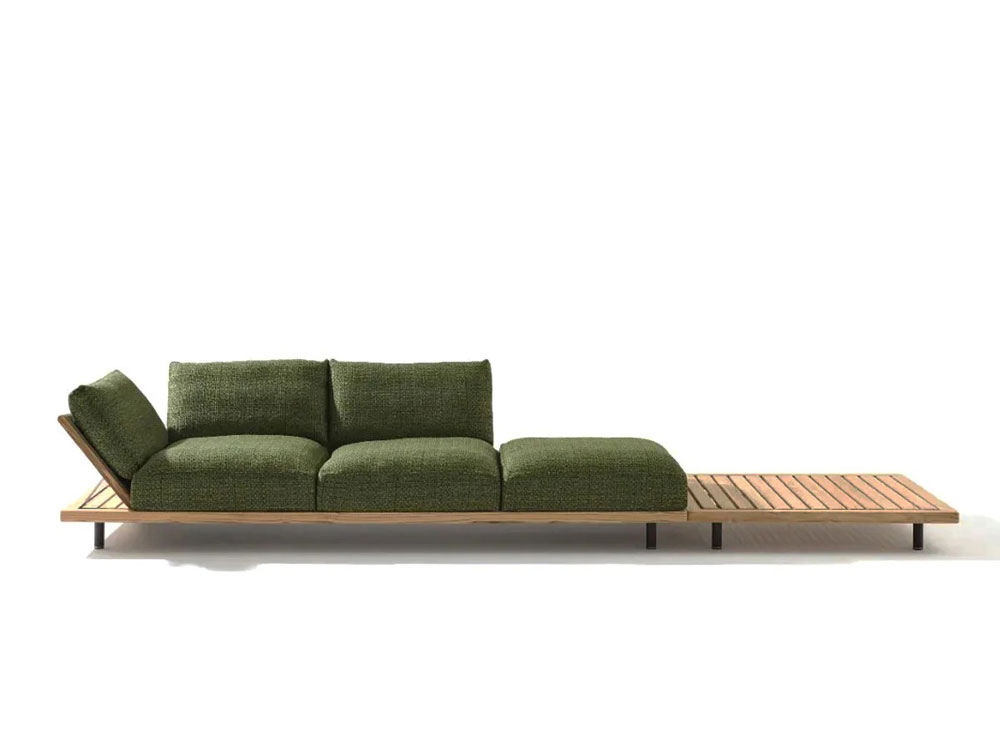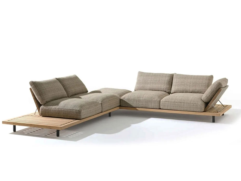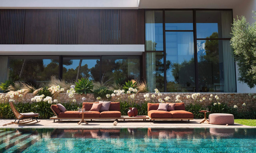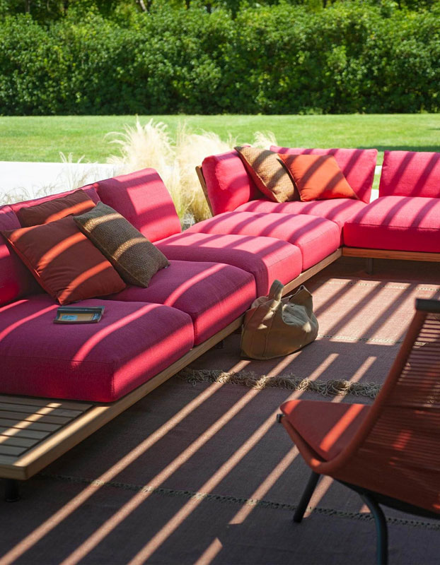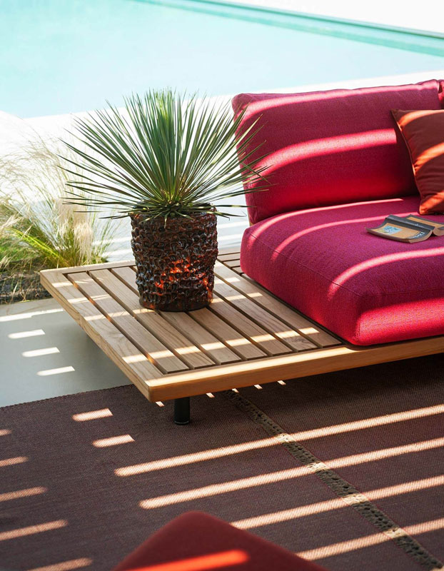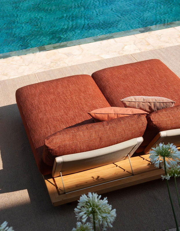 L’un des éléments distinctifs de la collection réside dans le dialogue entre matériaux et textiles. À la solidité du teck s’associent des coussins généreux, conçus pour garantir confort et durabilité dans le temps.