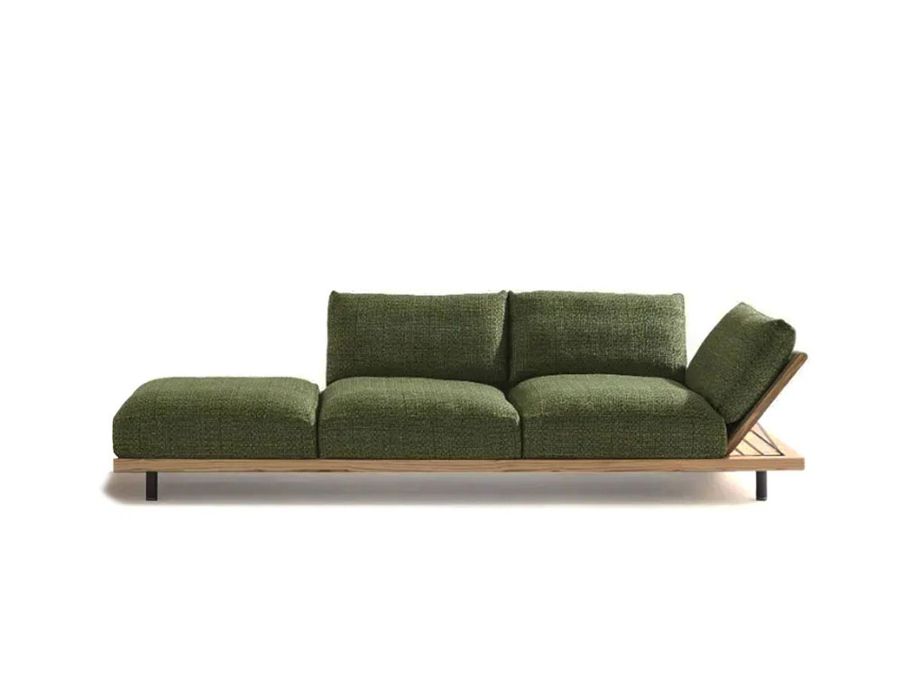 La signature de Rodolfo Dordoni se reconnaît dans sa capacité à maintenir un équilibre subtil. Les proportions sont basses, les lignes essentielles, et la structure en teck dessine une présence solide sans jamais s’imposer.