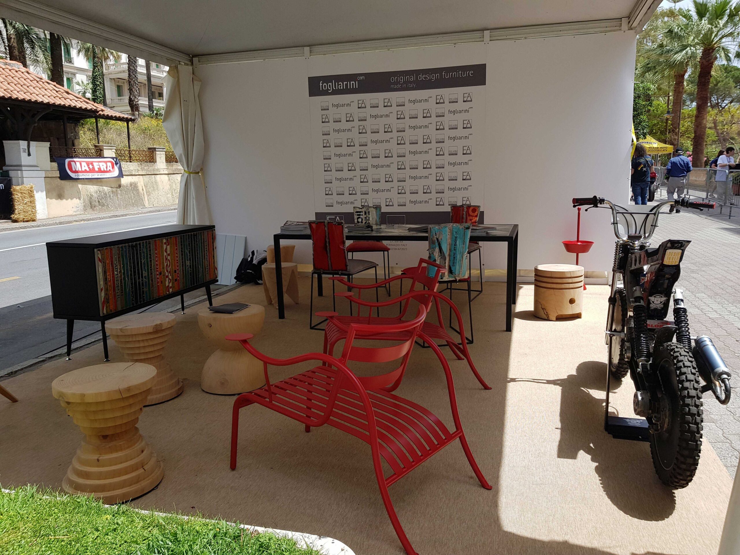 Notre stand dédié au design italien avec la présence de meubles en tôle recyclée de Vibrazioni Art Design et les magnifiques pièces de créateurs en bois de Riva 1920