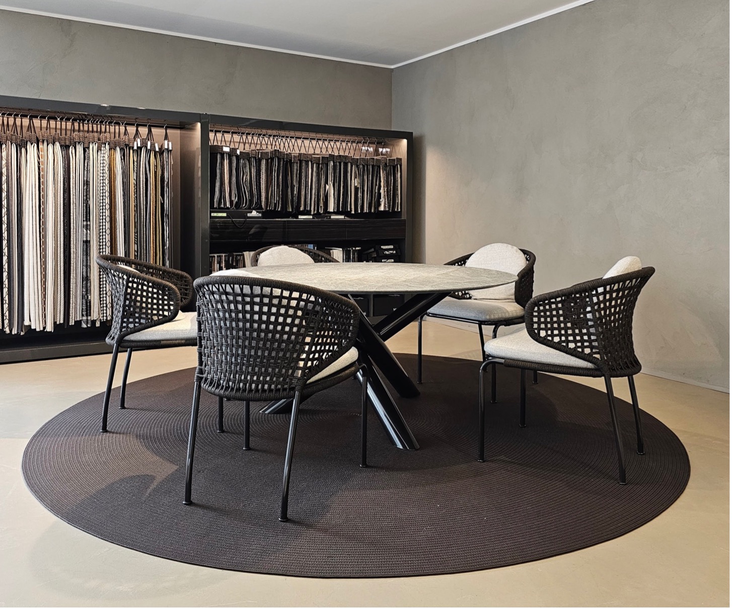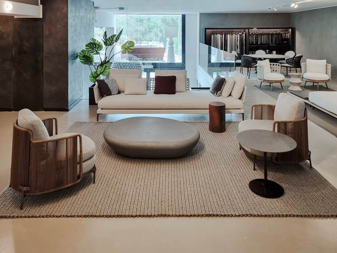 (nella foto: Divano Patio – poltrone Tape Cord – tavolino centrale Stony – tavolino da esterno Bellagio – Minotti – showroom Arredamenti Fogliarini Perinaldo).